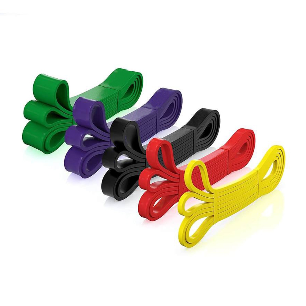 Set of all 5 resistance bands. Extra heavy duty made from multiple layers of latex for strength and durability.  Resistance bands range from 15 lbs to 100 lbs of resistance.  Perfect for preforming pull ups, stretching, squats, hip thrusts.