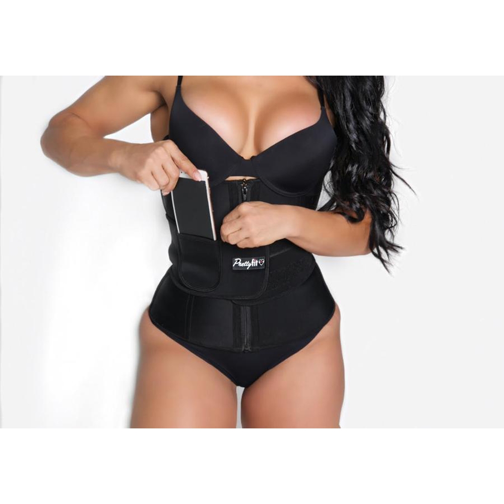 The Pretty Fit waist trainer gives you the support and coverage of a classic waist trainer with the flexibility, adjustability, and comfort of a sweatband. The Pretty Fit waist trainer can be worn during high-intensity workouts, cardio, and abdominal exercises while taking procaution. It features a zip-up fastener and adjustable elastic velcro straps for different levels of compression. There is also a pocket to hold your phone, keys, or cards while you work out for accessibility.
