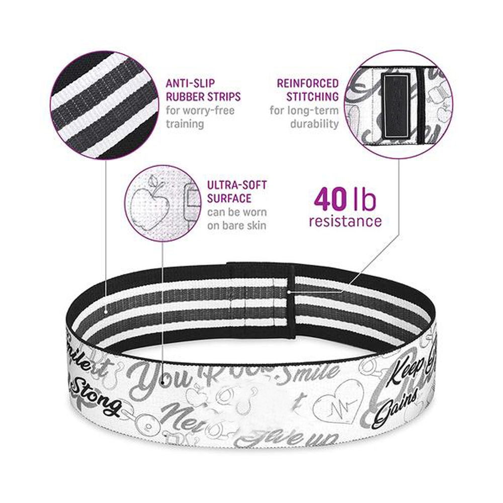 Ultra comfortable non slip booty bands. These ones are a little bit easier then the solid color booty bands around 40 lbs of resistance. equal to about the orange in our standard Laytex bands.  You'll love the motivational quotes on them as your working out telling you to keep going and sweet. ;)