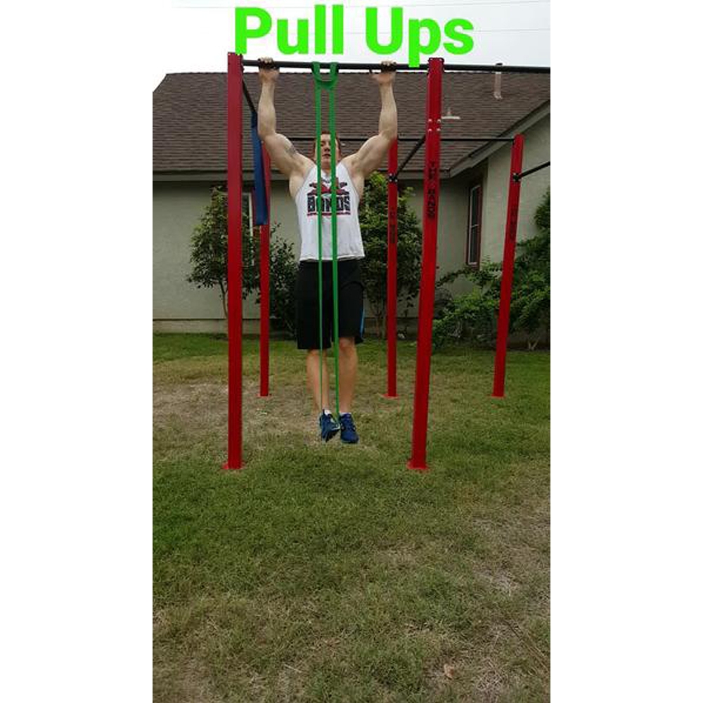 Set of all 5 resistance bands. Extra heavy duty made from multiple layers of latex for strength and durability.  Resistance bands range from 15 lbs to 100 lbs of resistance.  Perfect for preforming pull ups, stretching, squats, hip thrusts.